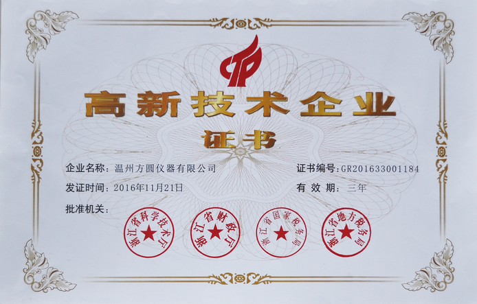 熱烈慶祝溫州方圓儀器有限公司順利獲得浙江省高新技術企業(yè)證書